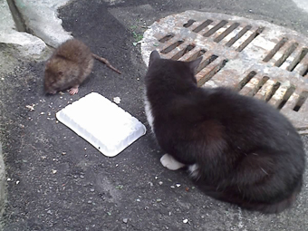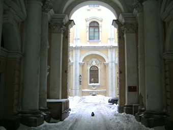 Говорят, штук 50, ибо большее число на такой территории не уживается, а меньшее Эрмитажу не по статусу (к слову: кошек в свежепостроенный дворец выписала из Сибири Екатерина Вторая, а после Второй мировой войны их пришлось завозить заново, уже из Ярославской губернии). Посему когда означенное число превышается, происходит "раздача слонов" в частные - хорошие - руки. В этот раз при содействии международно-подземной газеты "Метро", бросившей клич о такой акции: с выдачей сертификатов о дворцово-дворянском происхождении раздаваемых и характеристикой с места работы, да. А работа, понятно, хищная - охрана подведомственной территории со всеми ея шедеврами от посягательства грызунов типа "крыса". И охраняют! - крыс нет, вообще. Лично я за три года видел всего одну, с год назад, да и та была пришлая и проникла сквозь кошачий кордон не далее метра от въездных ворот, где разделила с привратным котом-"шлагбаумом" скромную кошачью трапезу, причем ела больше она, а кот мирно её созерцал, и - ушла восвояси, за ворота. Как говаривал Гоголь, "пришли, понюхали и ушли", в данном случае - "покушали и ушли", фото прилагается. Но эта фотография на выставку не попала (будучи посланным мною же в ту же газету, собиравшую у народа изображения эрмикошек) - цензура! Зато попала другая, снятая мною этой морозной зимой по приходу на работу: вот он - черный кот на снегу в арке одного из внутридворцовых дворов.