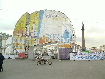 Питерский трансформер: три в одном2010-06-07. Leonid Engalichev Первое - День города. Второе - День пограничника. И третье - День защиты детей. Первое стартовало в четверг возложением официальными лицами цветов к основателю города Медному всаднику утром и, громыхнув фейерверком вечером, взяло тайм-аут до субботы. Второе, заполняя образовавшуюся лакуну, раскинулось в довозводящихся декорациях Дворцово-праздничной площадки, материализуясь в виде отдельно бродящих группировок в зеленых беретах и со змеино-зелеными флагами на ветру. После чего - в субботу - первое предприняло спурт от Площади Восстания по прямой перспективе Невского в виде колонны байкеров, последуемой многочисленными каре цветастого карнавала, и финишировало на той же Дворцовой.