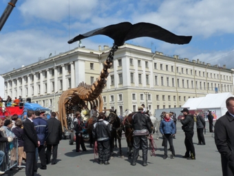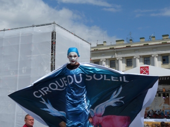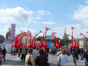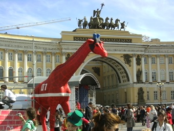 Особенно порадовало нашествие жирафов: французское стадо «Жирафы», эстонский бродячий театрик «Королевский жираф» и просто жираф – то есть не просто, а жираф Пожарный, но этот у же когда пламя празднества перекинулось с уик-энда на понедельник, для чего обильные конструкции площадного декора сбросили кожу локальной расцветки и обрасли новой – детскорисуночно-пестрой, в бабочках и прочих воздушных шариках.