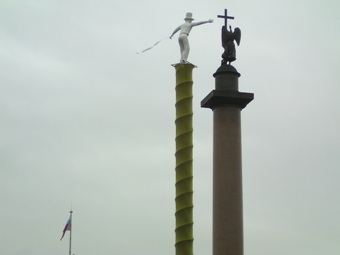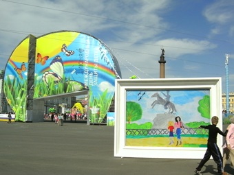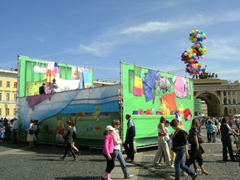 И это был деятельный понедельник! Дети летали в небо, подпрыгивая на гигантской кровати-батуте, дети рыли норы в огромной горе песка, переброшенной сюда «белазами» из пещерного поселка Саблино, дети красили томсойеровский забор, опоясовший не только ограду Александрийской колонны, но и ограду этой ограды, защищающую первую от вандалов, повадившихся отпиливать украшающих ее двуглавых орлов на сувениры, и, наконец, дети плясали и пели на сцене, коея стояла на том самом месте, где в прошлом августе плясала сама Мадонна (бог ты мой!), а за пару лет до нее тряхнул стариной сэр П.Маккартней.