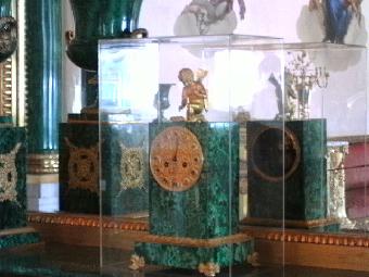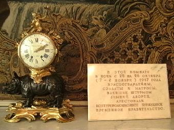 А сейчас - вперед: пробегая Восточную галерею, трудно не заметить четырехметровый Механический оркестр - ходики с двумя 60-тикилограммовыми гирьками и мощным органом - шедевр питерского австрийца Лео Штрассера. Выбежав из галереи, заглянем в комнату с солнечными и астрономическими часами Петровской эпохи и, резко уйдя вправо, влетим в Малахитовую гостиную, где всё из малахиту, включая дуэт небольших каминных часов, следящих друг за дружкой с противоположных концов залы. Чуть отклонившись влево, ступим на исторический паркет Малой столовой, как ступил на него в октябре1917-го года Антонов-Овсеенко, объявив Временное правительство низложенным: часы-носорог с китайчонком тому свидетели!
