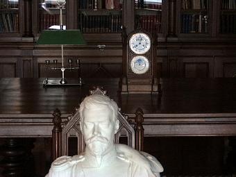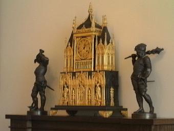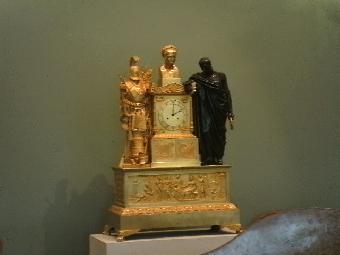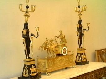 Часовщик летит далее, следуя своему маршруту вкруг Зимнего, а мы, наслушавшись, продолжаем шествие по русским интерьерам: вот солнечный Фаэтон на колеснице, вот пламенные Минин и Пожарский, вот часы готические с рыцарями и наконец - готические же часы Николая Второго в готической темного дерева библиотеке Николая же Второго.