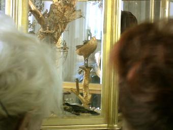 Гурьев отворяет створку стеклянного павильона-клетки, входит в него и - заводит часы. А надо сказать, что помимо павлина, сидящего на ветке золотого дубка, в постановке участвуют грибы разного калибра, белка с желудем, петух и сова. После заводки сова начинает бешено вращаться, циферблат, устроенный в шляпке самого крупного гриба, тоже крутится, но помедленнее, павлин расправляет хвост и - под громкое «ах!» зрителей - поворачивается всем корпусом вправо, а потом в обратную сторону, и - застывает в прежней позе. Тут наступает черед петуха: вскинув голову и приоткрыв золотой клюв, издает он хриплое британское «ко-ко-ри-ко». Блики вспышек фотоаппаратов, традиционное гурьевское «вот и всё, пожалуй» и дружные аплодисменты собравшихся. Но... в этот раз после слов, мастер принялся за дело и на глазах у публики - наших с вами глазах - взял и оторвал петуху голову! Затем он приподнял птицу за шею и, отделив верхнюю часть тела вместе с крыльями, опустил ее на «землю», которая, будучи тоже частично приподнята, обнажила под собою тьму анкеров и шестеренок. Петух ли «дал петуха», гриб ли выдал неверные цифры, или же это всего лишь профилактический осмотр механизма - этого мы с вами не узнаем, поскольку оставляем зал и перемещаемся по периметру дворца (против часовой стрелки), дабы упредить траекторию дальнейшего движения часовщика (по часовой стрелке) и, глянув на встречающиеся по пути хронометры, успеть встретить его в намеченной мною точке.