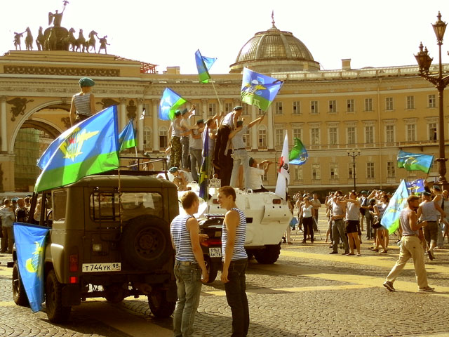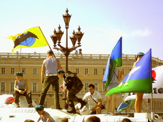 Возложив, едут на Дворцовую – как же без нее! – площадь, где тусуются некоторое время, с песнями-пивом, а потом перемещаются в Центральный Парк Культуры и Отдыха, что на Елагином острове, и на лоне природы внимают звукам праздничного концерта да пытают силушку в молодецких своих игрищах.