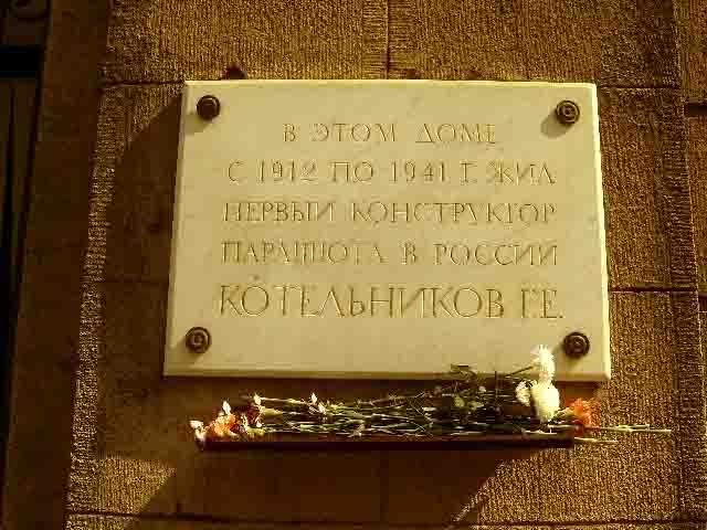 А на самом доме висит мраморная мемориальная доска с надписью золотом: "В этом доме с 1912 по 1941 год жил первый конструктор парашюта в России Котельников Г. Е." К этой-то доске и возлагают десантники в утро своего праздника букетик гвоздик.