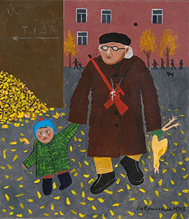 В.Г. - к исходу 70-х годов приходит к осмыслению примитивистских приемов в живописи как специфических выразительных средств. Но его наивистская интонация вполне отрефлексирована, проникнута абсурдистским мироощущением и окрашена социокультурными импульсами «советского образа жизни» 70-х, что нашло яркое выражение в изобретенном им методе создания картин: фотографии в первых страниц советских газет, будучи переведенными маслом на холст, получали цвет и новое звучание. О.К. – в 1982 годе завел себе двойника: образ композитора в авербаховском фильме «Голос» списан с О.К., а роль исполнена артистом Сергеем Бехтеревым, который, как и прототип его героя, обитал в той же части города, где вполне мог столкнуться – да и наверняка не раз сталкивался – с О.К., ведь столкнулся же я как-то уже в 90-ых с самим сияющим нетрезвой улыбкой актером, бредущим к своему дому в Гавани В.О. по пустынной 16-ой линии, притом что О.К. проживает на 15-ой. В.Г. – в 1980-е годы в творчестве В.Г. нарастают социальные мотивы, однако, его репрезентативные портреты и жанры трудно причислить к набирающему силу соц-арту, поскольку они очень индивидуальны, ироничны и не теряют нарративности. К стихотворному циклу «Изделия духа» прибавился цикл «Питейное дело», созданный на нелегкой основе как всенародного, так и личного опыта в этом деле. О.К. – из фильмов, к которым писал музыку в 90-ых, – «Нога», «Год собаки». Создал также музыку к спектаклю «Бесы» (по Достоевскому) в питерском Малом драматическом театре. На редких своих концертах в музее-квартире И.Бродского, или на бастионе Петропавловки, часто играет, обмотав голову наволочкой, чтобы никого и ничего не видеть: «Играть людям очень трудно, они вызывают чувство величайшей усталости, уже когда приходят». При этом играет еще и откинувшись назад - практически лежа: «Мне так удобнее. Я бы в Филармонии весь оркестр положил, может, они тогда лучше бы играли». Во время исполнения часто комментирует последнее: «У меня рука гениальна, как у зверя», или - «Ничего не получается».