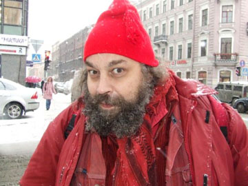 В красном своем пальте, в кучерявой своей бородушке да с гнусавой своей шарманкою походил он скорее на фальшивого итальянского бродягу времен папы Карло, а еще более на питерского художника (по образованию маляра), в постперестроечные времена активно эксплуатировавшего образ Ильича (первого) в сюр-соц-стилистике, а также придумавшего букву «Ы» в названии поп-рок-группы «АукцЫон», Кирилла Миллера.