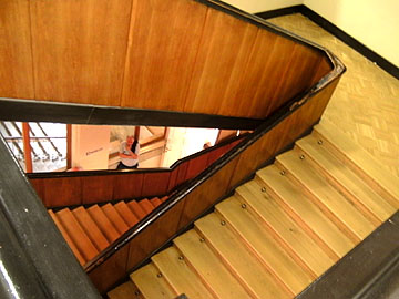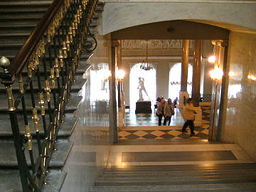 Лестница2011-09-25. Leonid Engalichev Деревянная лестница – таково ее официальное название – и впрямь деревянная лестница, ведущая посетителей из залов французского искусства 18-го века на втором этаже Зимнего дворца в залы экспозиции Франции века 20-го. То есть не шибко длинная, но довольно широкая и пожароопасная. Бронзовый стол на верхней лестничной площадке с бронзовым же натюрмортом на нем - работа колумбийского художника Фернандо Ботеро. Все видели какую-нибудь из его поделок: персонажи его полотен и скульптур весьма телесны.