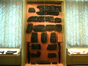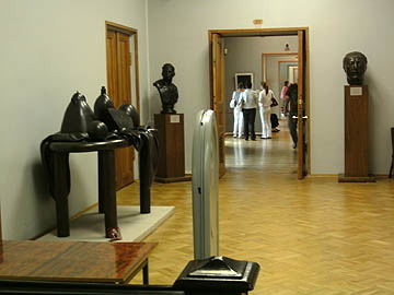 А на площадке второго этажа, где заканчивается (или начинается) Деревянная, в трёх метрах в сторону, начинается (или заканчивается) другая лестница – Октябрьская, соединяющая этот второй этаж с первым. Октябрьская она затем, что именно ее якобы штурмовали большевики октябрьской ночью 1917 года. И от нее же начинается экспозиция артефактов древнего согдийского царства в залах первого этажа дворца: прямо под «Черным квадратом» (точнее в эпицентре этой черной дыры) представлены образцы деревянного творчества государства, располагавшегося некогда близ города Пенджикент на территории нынешнего Таджикистана. Пенджикент являлся одним из важнейших культурных и ремесленных центров Зороастрийской Согдианы, его даже называли «среднеазиатскими Помпеями». Своей сохранностью памятники резного дерева Древнего Пенджикента обязаны пожарам: остатки деревяшек были найдены в помещениях, где они, не успев сгореть целиком, были засыпаны рухнувшими кровлями. Итак, если учесть еще и масштабные черные иероглифы японской калиграфии по-соседству с «сулажем», то общая картина лестниц(ы) представляется весьма мрачной и абстрактной. Наивно-китчевый Ботеро здесь если и уместен, то лишь в представлении хладно-монохромного натюр-морта. А салонный и фигуративный «бюффе» и вовсе вынесен вон.