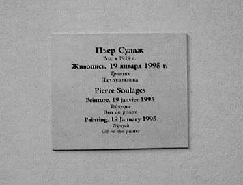 И вот поднимался я как-то по этой лестнице, а навстречу мне спускались иностранцы. На предпоследней площадке они остановились и принялись твердить: «суляж, суляж». Не сразу я сообразил, что этот сплошной суляж есть то, что на картонной табличке в месте нашей встречи транскрипировано как «сулаж» - без французского прононса. Над табличкой висит картина – для Эрмитажа довольно редкая не только потому, что произведений конца 20-го века в нем мало, но и по форме – вертикальный триптих.
