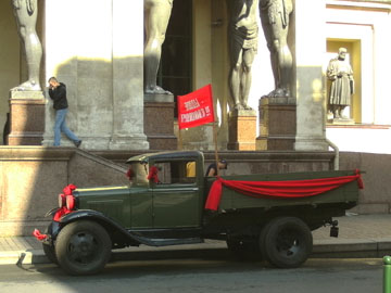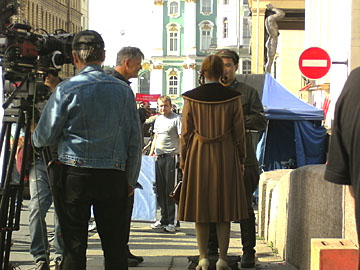… Чкалов снова вернулся! Вы помните, как он в тридцатых пролетел под Кировским мостом? А потом еще раз – уже в фильме 41-го года «Валерий Чкалов» (артист Белокуров)? Так вот – ныне он явил себя народу в теле актера-ромасеро Дятлова (в ипостаси артиста известного тому же народу по сериалам типа «Улицы недобитых фонарей») – точнее, явит в будущем сериале же про Чкалова. Съемки свиданки в праздник на мостике чрез Зимнюю канавку шли весь день, и весь день по Миллионной улице слонялись то врозь, то кучно люди в предвоенных одеждах с демонстративными лозунгами и воздушными шариками.