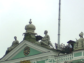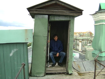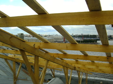 … а на крыше-то Зимнего всё ремонт да ремонт! Старую жесть кровли содрали, новую еще не надели, заодно ж обновлят и чердак: шкурят-красят стальные конструкции, плюс наваривают новые – для пущей стропильной крепости. А для укрытия прорехи от небесных осадков понадстроили ище одни стропилы, уже древесные, и понакрыли их армированным полиэтиленом. Такой маскировки дворца жители города с самой блокады не видали - так что не жизнь у меня теперя на крыше, а парник и только!