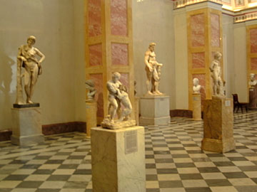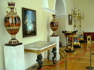 Плюс часть бывшего кабинета Николая Второго в Русских интерьерах Зимнего Дворца с меблировкой в помпейском стиле работы архитектора Александра Брюллова, включающей и картину его брата Карла.