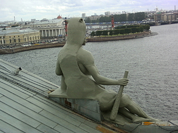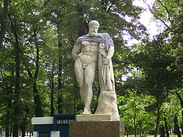 А вот так выпускники Военно-морского инженерного училища, располагающегося в зданиях Адмиралтейства (через улицу от Зимнего) празднуют окончание своего обучения в оном – напяливая на мирно стоящего в аллее Адмиралтейского сада античного героя тельняшку.