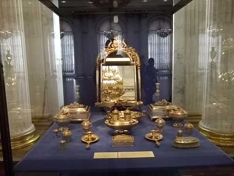 А вот сын поэта Тарковского– Андрей – пошел еще дальше и снял кино под названием «Зеркало». Хотя вполне мог заснять и какое-нибудь трюмо. Так вот: серебряное зеркало княгини Наталии Голицыной, дочери графа Чернышева, выставлено сейчас, как новое приобретенье эрмитажной коллекции, в Георгиевском зале (он же Большой Тронный – трон тоже отлит из серебра!) вкупе с остальными 20-тью предметами туалетного прибора.