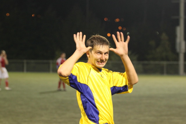 We'R United FC vs Red Devils United 5:02010-10-03. Leonid Puhovskiy Голы: Лейцус (1:0), Пуховский (2:0) - пен, Кайда (3:0), Логинов (4:0), Актаев (5:0) На матч против команды Red Devils, United вышел в желтой форме. С самого начала матча наша команда захватила инициативу, и создала несколько очень опасных моментов. Чего стоит хотя бы упущенная Пуховским возможность поразить ворота с линии вратарской площади ударом ножницами. Такое уверенное начало немного усыпило бдительность футболистов в желтой форме, в результате чего случился момент с последующим назначением пенальти в наши ворота. Султан Актаев проиграл борьбу на лицевой линии нашей половины поля, и вынужден был сфолить дабы нападающий дьяволов не вышел на рандеву с вратарем. Как выяснилось через несколько минут этот фол был абсолютно оправдан, так как Виктор Степанюк в блестящем стиле парировал одиннадцатиметровый удар!!!!!!! Этот момент придал футболистам We'R United еще больше уверенности. Они продолжали методически проводить острые атаки на ворота соперника, и вот после одной из таких атак Рома Лейцус оказался первым на подборе возле штрафной, технично обыграл защитника и тот вынужден был сфолить. Исполнять штрафной вызвался сам пострадавший. Мяч был установлен примерно метрах в 25 от ворот, практически по центру. Стенка установлена, судья дает свисток, разбег, удар, и джамбулани по непредсказуемой траектории залетает за спину вратарю и от перекладины влетает в ворота!! 1:0!!! До конца тайма счет не изменился, хотя у обеих команд были хорошие возможности для взятия ворот. Сначала Саша Сидор войдя в штрафную с правого фланга, убрал всю защиту соперника на замахе, и пробил с левой, но мяч чудом разминулся с воротами. Затем после отличной комбинации United, Юре Кайде буквально доли секунды не хватило что бы опередить защитника и вколотить мяч в ворота. Ну и в самом конце тайма была прекрасная возможность у игроков в красном сравнять счет, их игрок выходил один на один с нашим вратарем, но Витя в очередной раз спас нашу команду и не проиграл нападающему в ближнем бою. На второй тайм We'R United вышел с явным намерением упрочить свое лидерство, и это им удалось в самом начале тайма. Леня Пуховский, который переместился на позицию нападающего в начале второго тайма, убегал один на один с вратарем соперника, и защитник, лишь ценою нарушения правил в своей штрафной площади, был вынужден остановить его. Как и в случае со штрафным ударом в первом тайме приведшим к голу, пенальти вызвался исполнять сам пострадавший. Судья поставил всех на свои места, дал свисток, ну а дальше Леня уже развел вратаря и мяч по разным углам ворот. 2:0!!! После второго забитого мяча футболисты в желтой форме взяли небольшой "перерыв" и отдали инициативу сопернику, за что тот и поплатился. Отличная контратака удалась нашей команде: Макс Борисов из зоны центрального полузащитника выдал пас на левый край штрафной площади, откуда Юра Кайда хитроумно перебросил вратаря который был вынужден уже третий раз за игру вынимать мяч из сетки своих ворот. 3:0!!! После этого случился момент который превратил оставшийся матч в пустую формальность. Игрок дьяволов получил травму и был вынужден покинуть поле, заменить же его было не кем. На последние 15 минут тайма автор победного гола Рома Лейцус дал возможность игрокам замены проявить себя, уйдя на замену. После этого Назик Ислам переместился 
