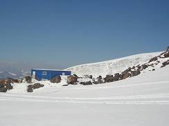 The last chair-lift section brought me to station “MIR”, 50 meters from which the base camp “Barrels” is located at the altitude 3,900 meters. (06) Gigantic fields of crevasses surrounded the place. (07) Barrel-shaped huts provide climbers with good protection from wind and bad weather. I paid for a place in the barrel (equivalent of $10 US per day), left my backpack, and ascended to the next camp “Priut of eleven” for acclimatization.