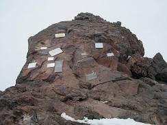 Several meters from the "Priut of 11" there is a rock with a memorial plates with names of climbers who died on Elbrus slopes. (10) There is no cemetery here, just the plates in memory of some of them. Elbrus is a dangerous mountain. Unpredictable weather and hidden crevasses might kill even very experienced mountaineers. (Recent sad news from Elbrus: on May 09th, 2006 eleven climbers died being trapped by a bad weather in the saddle between the West and the East summits.)