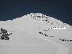 Next day after arrival to “Barrels” I climbed to ”Pastouckhov Rocks” (11) for acclimatization. “Pastouckhov Rocks” at the elevation 4700 meters is a natural reference point on the route. It is located half way from the “Barrels” to the summit. Nowadays commercial expeditions provide their clients with a ride on snowmobiles (12) from the “Barrels” to the Rocks. The last 900 meters of elevation clients gain by feet. A frustrating practice.