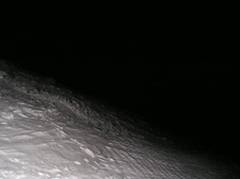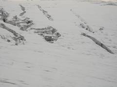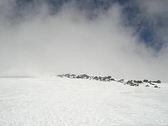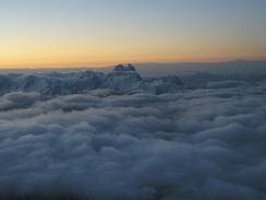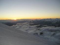 Tired from the previous climb, I spend the next day mostly resting at the Barrels, recovering from the dehydration and the energy loss. In the evening I relocated from the Barrels to a small hut at 4,100 m in the "Priut of 11" area in order to save time for the next morning ascend. I started the climb at 2 am with almost clear sky. In 45 minutes I was at the bottom of Pastuckhov Rocks. After yesterday stormy weather, all footprints were hidden under the snow. However till the bottom of the Rocks I was able to divine the snowmobile tracks, with only 7-8 cm of fresh snow above the compacted surface. Along the Rocks I continued the climb mostly in a knee-deep snow. I was alone on the route, only the mountain and me. That usually gives me some extra sense of nature, but one of the prices for that is a hard strenuous work on cutting the steps in a deep snow. My pace slowed down though I moved without stopping. Some time later I reached the upper edge of Pastuckhov Rocks, and tried to find rods, which mark the trail. My headlamp illuminated not great spot around me. Otherwise it was completely dark. (18) To tell the truth, I didn't expect to reach a top of the Rocks before the dawn. Next part of the route from the top of Pastuckhov Rocks to the saddle between West and East summits is the most dangerous one. Beginning from the elevation 3,500 meters Mt. Elbrus is covered by glaciers with the total area of about 150 square kilometers. Huge crevasses are everywhere; most of them are hidden under snow. (19) is a picture of the area in daylight. The trail carefully marked by rangers passes among those crevasses to the saddle, sometimes a couple meters from crevasses or on the snow bridges above the hidden ones. The climb itself is not technical. Elbrus's icy slopes are not steep generally. The steepness amounts 35 degrees only in some areas above 4,000 meters. The problem was that I couldn't find the marks in the darkness. I had a choice to wait for a dawn, or to move without a trail. The direction was clear for me. I removed a ring from my ski pole and continued the ascend using the ski pole as a probe to check for hidden crevasses in front of me. Being alone I couldn’t afford to make a mistake by falling down into a hidden crevasse through a snow bridge. By 6 am the sky on the East became lighter (20), I saw a beautiful peak Ushba far away. (21) I was above the clouds, and the sky overhead was clear.