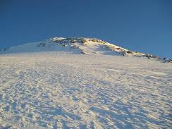 At 7 am the sun rose up on the horizon, and immediately it became very light. (22) I saw the marks; I climbed just 30 meters from the trail. Old tracks on the marked trail were covered only with 10 cm of snow, and it was much easier to follow. The picture I took at the moment of sunrise was the last one my camera was able to snap. The camera was dead. Though I kept the camera in the inner pocket to prevent it from cold, my night pictures had required too much from the batteries and a LCD display. Changing batteries with the spare ones didn’t help. That was not so good, but what could I do? With the daylight and the marked trail my pace became faster and two hours later I reached the saddle. Looking back I saw a couple below, which followed my steps. I waited for them to ask if they have a camera. They had one. That was better. I continued to the West summit, and the couple stayed on the Saddle to melt some snow for drink. They joined me on the summit, and thanks to the young couple who put my memory card into their camera, I have some pictures from the top of Elbrus. (23)