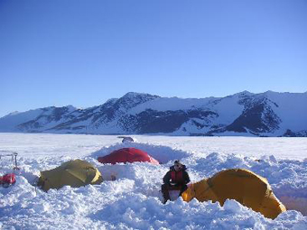 So, I tried to do my best to be back in time and was lucky enough to succeed in that. | | There is nothing permanent in the Patriot Hills camp. It is located about 1800 miles from the nearest city. In a season you will find few tents there. The Hills partly protect camp from a strong wind, however a good practice is to dig into the snow as far as possible. |