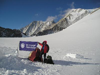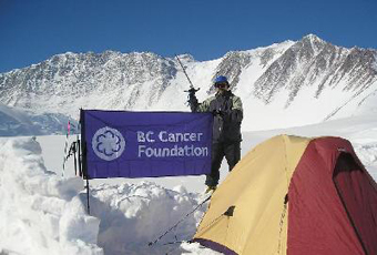 At the base camp. | | The main goal of this climb was to raise funds for cancer research and care with the BC Cancer Foundation. Near my tent I made several pictures with the BC Cancer Foundation flag. Vinson Massif is on the background. |