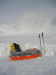 Next morning after flying to the base camp I was ready to move to the Camp1. I had about 45 kg to carry. I didn’t know how long I would climb the mountain. It all depended on the weather. So, I wanted to make my Camp 1 to be an advanced base camp with food, fuel and equipment enough for a long climb. | | The weather was reasonable. The sun in Antarctica gives light, but not very much heat. In daytime it is not so bad, but at night, when sun is behind the mountains it is getting extremely cold. My new boots were rated up to – 50° C. When I moved, it was warm enough. However, sometimes when I stayed in the evening near my tent for 10 minutes I felt like I am wearing home slippers, not the mountaineering boots. |