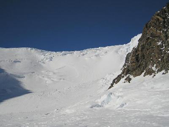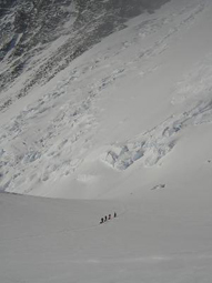 The upper part of the Head wall is a huge field of seracs. The ice is as solid as a bottle glass. The crampons left very little tracks on it.