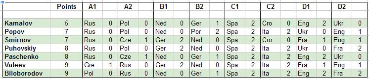Евро 2012 - прогнозы и победители2012-06-19. Rassim Kamalov Очки начисляются так: два очка - за правильно угаданное место, с которого команда выходит в четвертьфинал, одно очко - за правильно предсказанный факт выхода. После заключительных матчей в группах А и В, лидируют Сергей и Артем. Посмотрим, что будет дальше... Вот и хорваты вылетели. Впереди Артем. Украина - молодцы! И команда, и тренер. А наш маленький конкурс выигрывают Артем Валеев и Лёня Белобородов. Поздравляем победителей! И просим зайти в профком для получения почетного вымпела.
